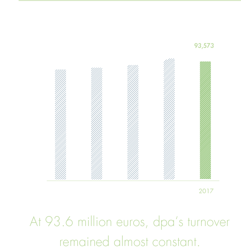 At 93.6 million euros (previous year: 94.0 million euros), the turnover of the German Press Agency has remained almost constant. The decline of 0.4 million euro, equivalent of –0.5%, is very moderate when viewed in the context of the above-mentioned general circulation decline in newspapers. In addition to the foreseeable decline in revenues at the dpa basic service and the national services, due to the continued decline in circulation figures, foreign-language services were also unable to match the sales level of the previous year. Here, the Arabic and English services were increasingly affected by the persistent crisis throughout the Middle East region, which forced various customers to either lower their costs or terminate services altogether. There was unfortunately no sign of a turnaround here.